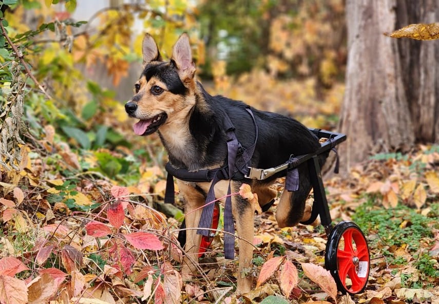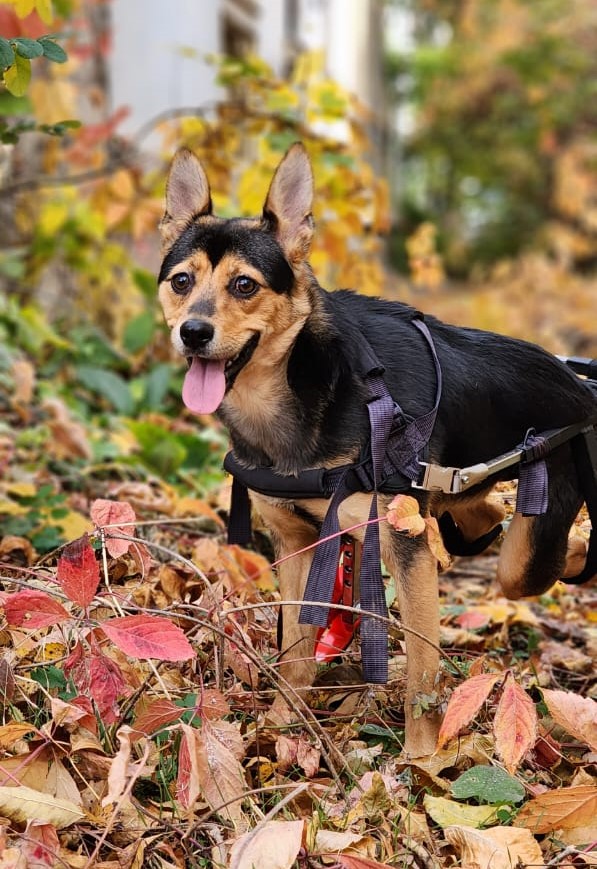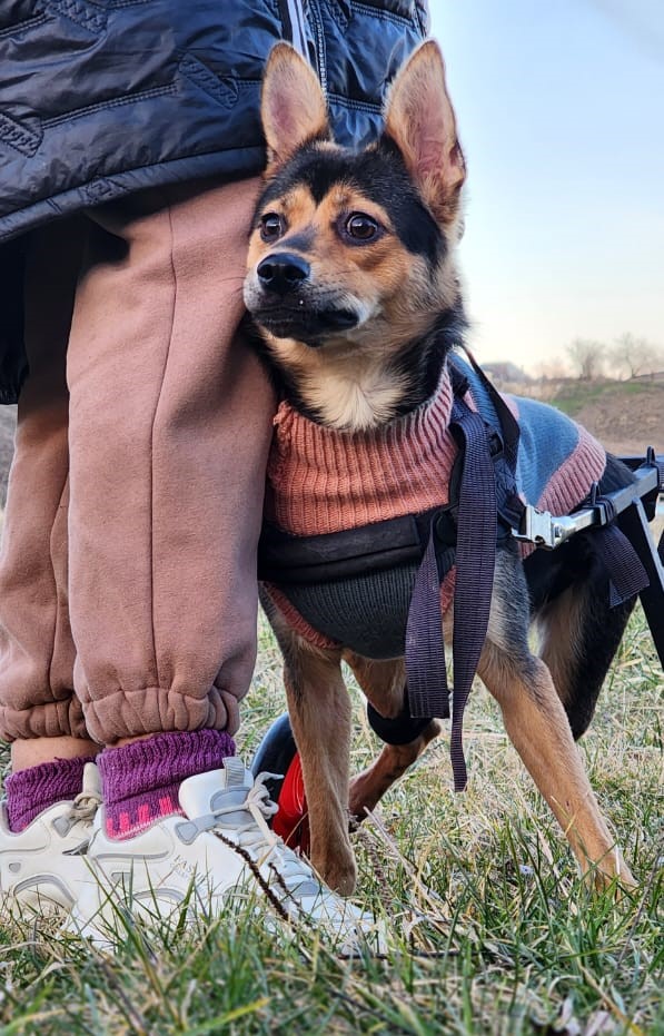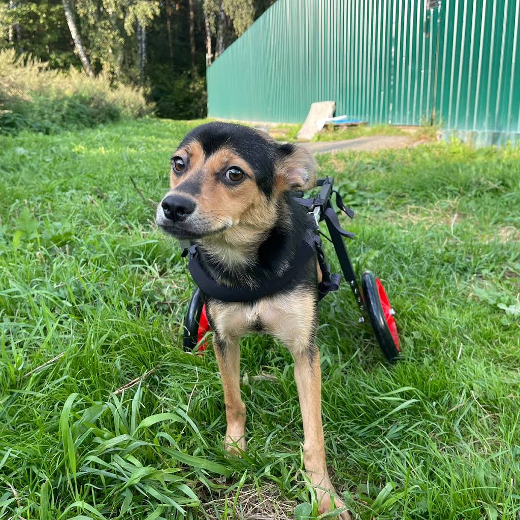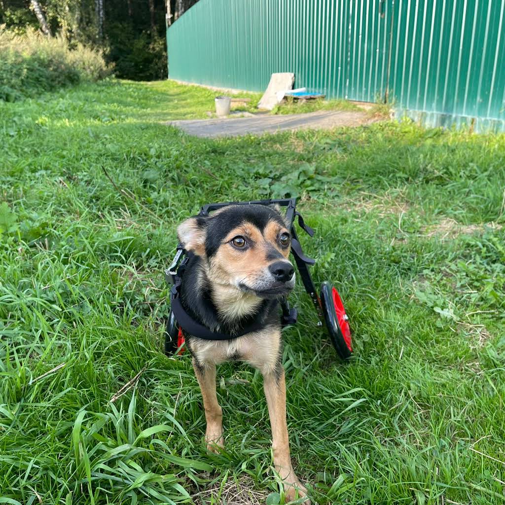 Малышка прекрасно бегает с помощью специальной коляски, играет и общается со своими сородичами, а в её глазах всегда горит радостный, жизненный огонёк, и мордочка всегда растянута в улыбке.)))